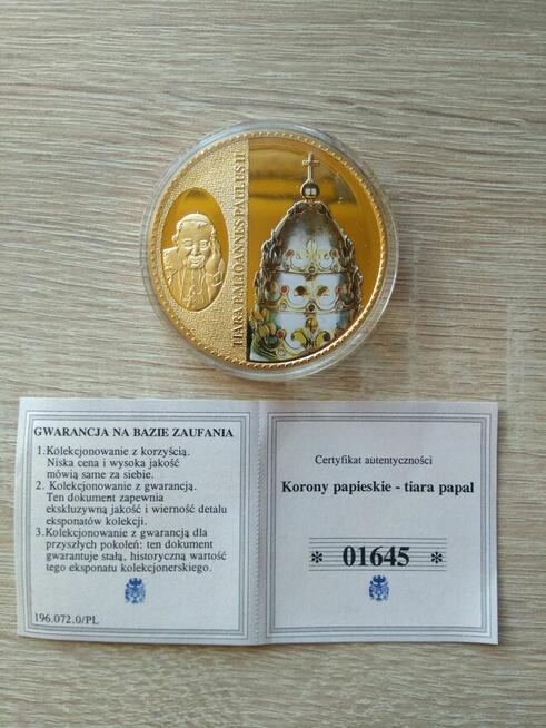 Medal okolicznościowy z serii Korony Papieskie Tiara. Medal wykonany w całości z miedzi i pozłacany. Cena 50 zł. Odbiór ...