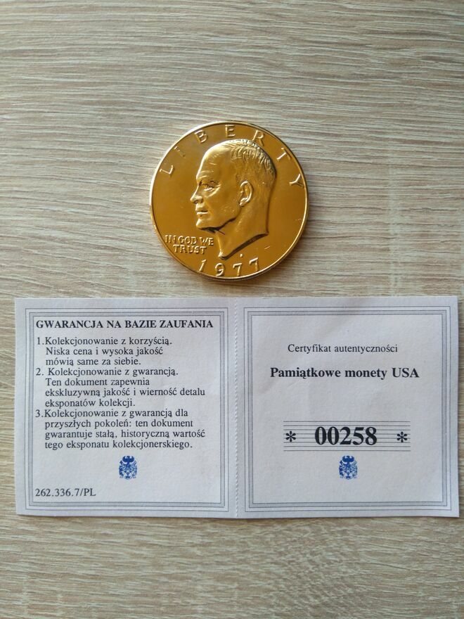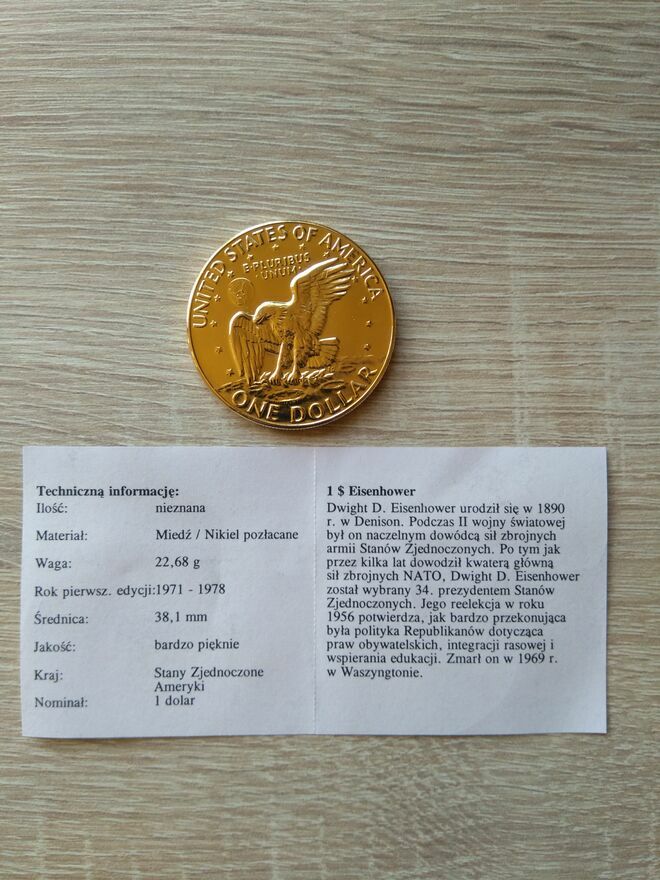 Replika amerykańskiego 1 złotego dolara z orłem. Wykonany z miedzi, niklu i pozłacany, stan nowy. Cena 50 zł. Odbiór osobisty lub wysyłka + 20 zł. Tel. 887 - pokaż numer telefonu -Sprawdź zainteresowanie tym ogłoszeniem