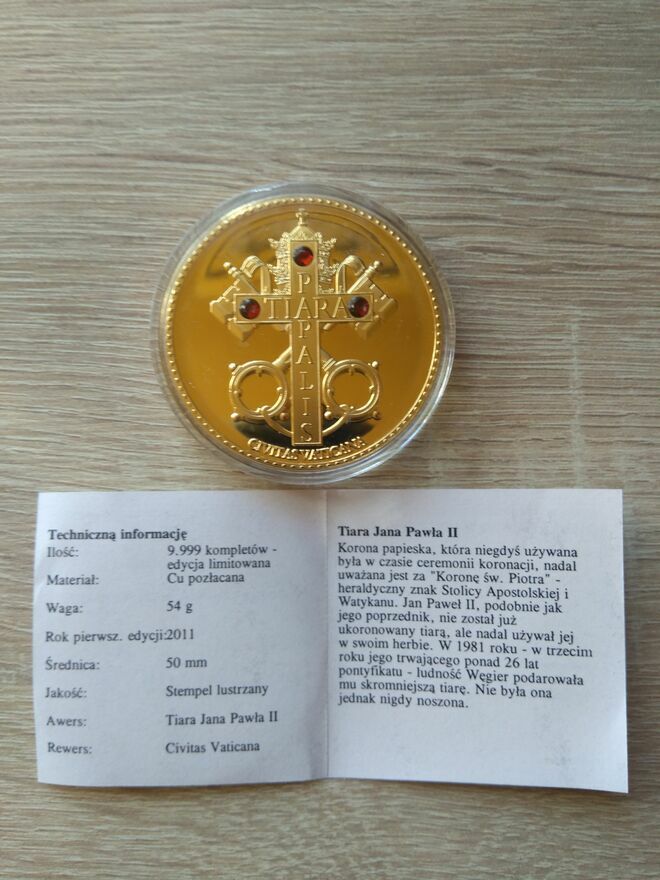 Medal okolicznościowy z serii Korony Papieskie Tiara. Medal wykonany w całości z miedzi i pozłacany. Cena 50 zł. Odbiór osobisty lub wysyłka + 20 zł. Tel. 887 - pokaż numer telefonu -Sprawdź zainteresowanie tym ogłoszeniem