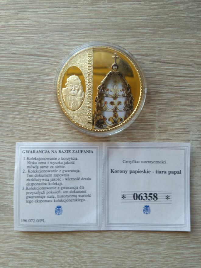 Medal okolicznościowy z serii Korony Papieskie Tiara Papal. Medal wykonany w całości z miedzi i pozłacany. Cena 50 zł. Odbiór osobisty lub wysyłka + 20 zł. Tel. 887 - pokaż numer telefonu -Sprawdź zainteresowanie tym ogłoszeniem