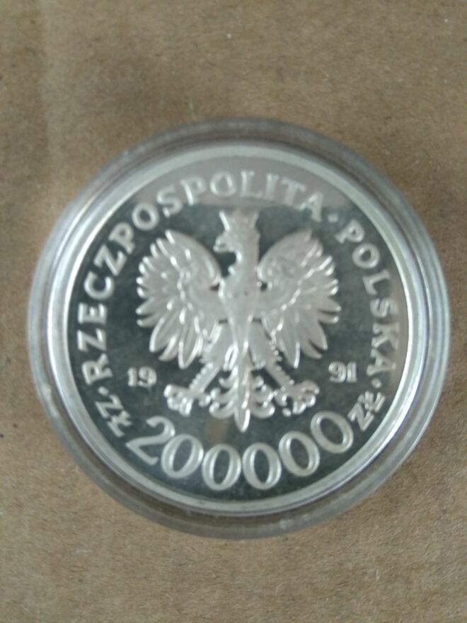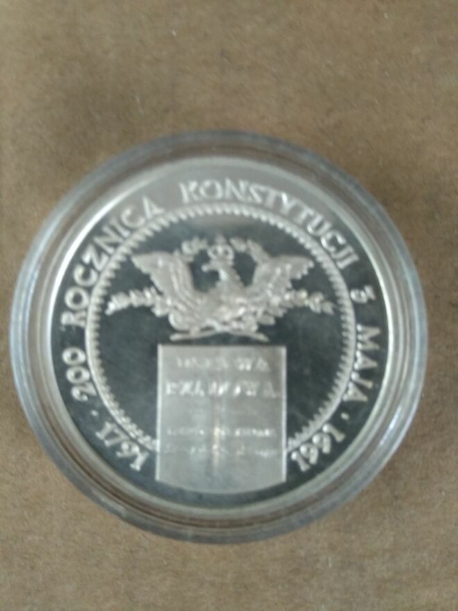 Moneta okolicznościowa o nominale 200000 zł. Moneta została wybita z okazji upamiętnienia 200 rocznicy Konstytucji 3 Maja. Przedmiot wykonany z czystego srebra próby 999. Stan nowy. Cena 700 zł. Odbiór osobisty. Tel. 8+8+7+ 0+8+0+ 7+7+5Robert