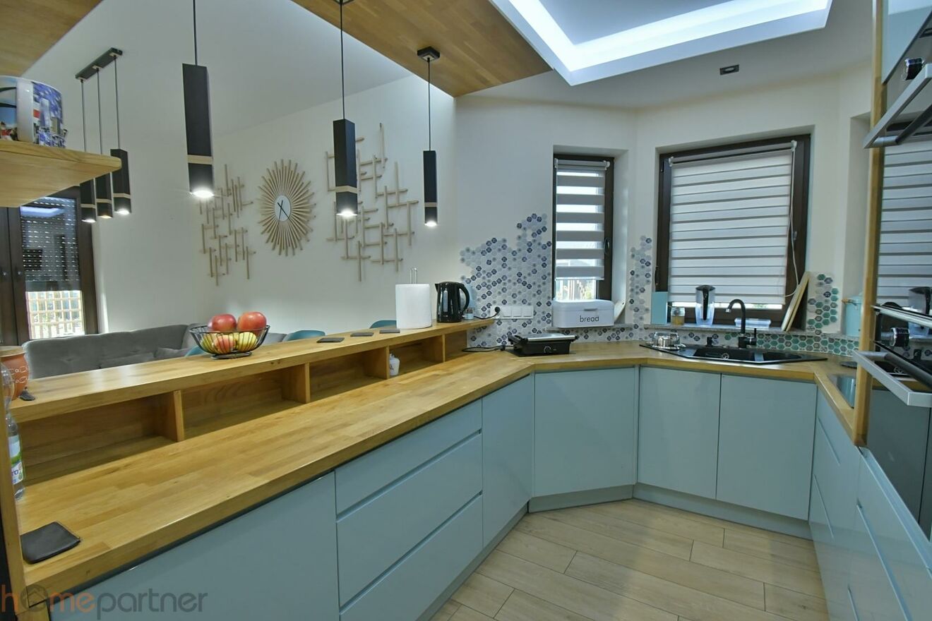 Ustawny salon z zachodnią ekspozycją i z piecem typu koza. Na podłodze na całym dole- kafle. Kuchnia w pełni wyposażona, w sprzęt wysokiej klasy-lodówka, piekarnik, płyta indukcyjna, zmywarka 60 cm, okap, mikrofalówka. Drewniane elementy w salonie (ława, stół) oraz w części kuchennej jednorodne - z drewna dębowego. Na ścianach w klatce schodowej elementy dekoracyjne - zmywalny tynk glinka wenecka. W sypialniach na podłodze panele.